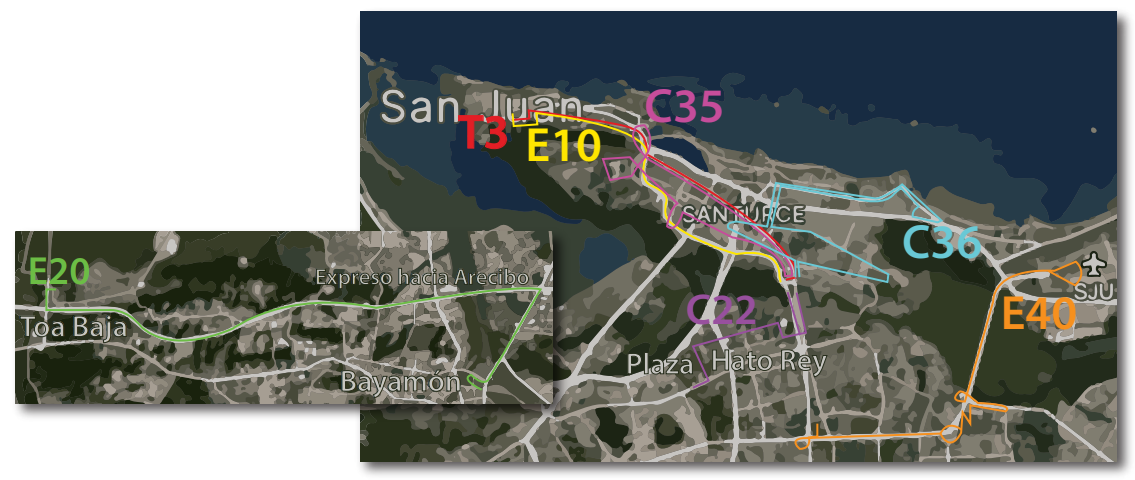 Hato Rey Sagrado Corazón al Cuartel General, Plaza las Américas, Estadio Hiram Bithorn, Coliseo Roberto Clemente, vía Ave. Ponce de León, Chardón, Hostos, calle Calaf, Las Américas y Ave. Roosevelt